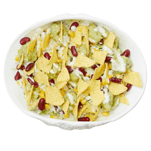 A zesty mix of fresh lettuce, sweet corn, black beans, bell peppers, and avocado, tossed in a tangy lime dressing and topped with crispy tortilla strips.