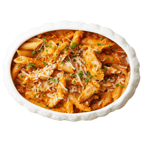 Al dente penne tossed in a fiery tomato sauce with garlic, chili flakes, and olive oil, finished with fresh basil for a bold Italian classic.
